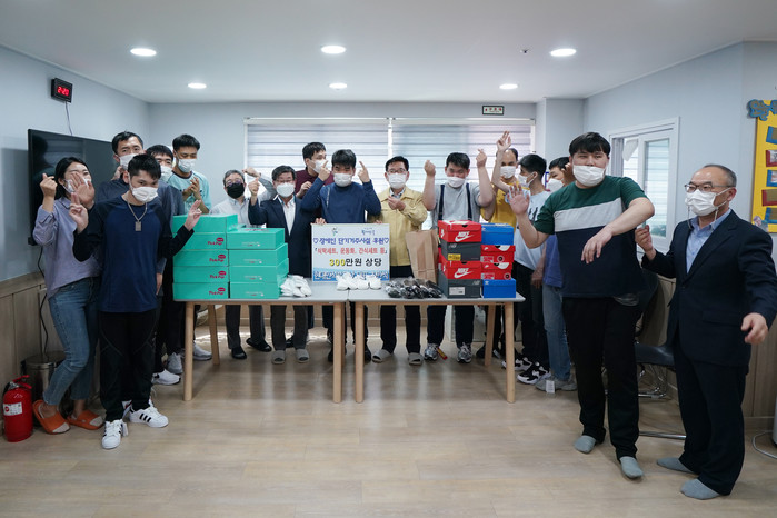 서울 동대문구 장애인단기거주시설 하늘꿈터는 11일 (주)현대만석부동산의 최만석 대표로부터 장애인들을 위해 식탁세트, 간식 및 운동화(환가액 300만원 상당) 등 후원물품을 전달받았다. 사진은 전달식에 참여한 유덕열 구청장(가운데)과 관계자들이 기념촬영을 하는 모습. (사진제공=동대문구청)
