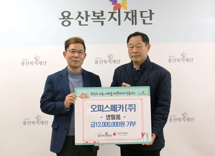 (주)오피스메카가 최근 서울 용산복지재단에 지역 소외계층을 위한 1200만원 상당의 생필품 지원을 약속했다. 지원은 분기별 300만원씩 총 4회에 걸쳐 이뤄지며, 이날 첫 번째 물품으로 손 소독제와 물티슈를 전달했다. 사진은 관계자들의 기념촬영 모습. (사진제공=용산구청)
