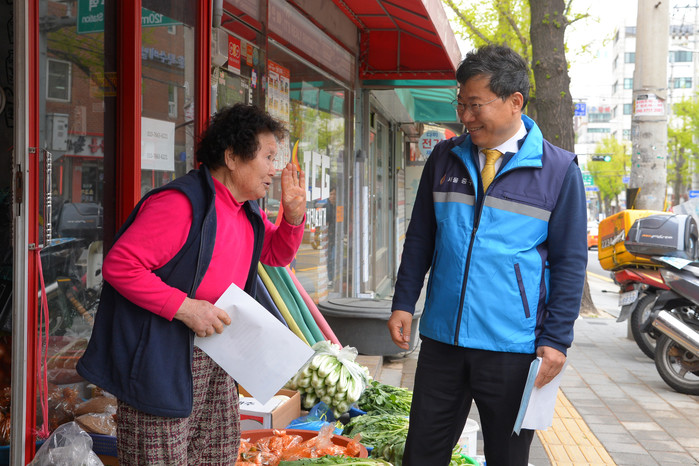 | ▲ 보행권 확보 캠페인에 참여한 서양호 구청장(오른쪽)이 '불법 유동광고물 설치 금지'등의 내용이 담긴 홍보물을 배포한 후 시민과 이야기를 나누고 있다. |