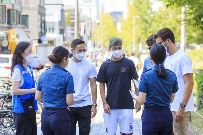 서울 마포구·서울마포경찰서·연남글로벌빌리지센터는 합동으로 지난 3일 홍대입구역 인근에서 ‘외국인 코로나19 선제검사’ 캠페인과 백신접종에 관한 안내문을 배부했다. 사진은 이날 외국인을 대상으로 코로나19 선제검사와 백신접종을 안내하는 모습. (사진제공=마포구청)