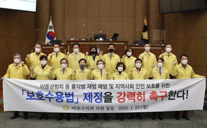 조 의장은 "아동성범죄 등 흉악범죄 전과자가 형기를 모두 마쳤다고 해도, 국민들이 안심하고 사회에 그들을 받아들이기는 쉽지 않다. 교도소가 진정 교정·교화의 역할을 다 하는가에 대해서 국민들은 고개를 갸웃거리는 것이 현실이다. 게다가 재범 방지책들이 대부분 극히 소극적이고 예방효과가 크다고 보기 어렵다. 마포구의회는 흉악범죄자 보호수용법 제정을 위해 힘써 국민들이 안심하고 생활하실 수 있도록 최선을 다하겠다"고 말했다.