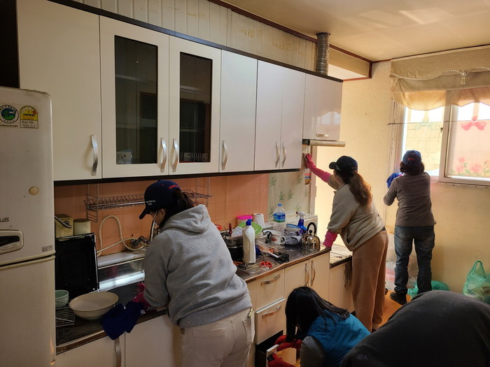 충남 아산시행복키움지원단이 희망봉사단과 함께 주거환경이 취약한 홀몸노인 가구를 대상으로 최근 이틀간 도배·장판 교체 및 곰팡이 제거, 페인트칠 등 주거환경개선 사업을 진행했다. 사진은 희망봉사단 단원들이 주방 청소를 하고 있는 모습. (사진제공=아산시청)