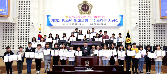 인천시의회는 지난 17일 '제2회 청소년 의회체험 우수소감문 시상식'을 개최했다. 사진은 이용범 의장이 시상한 후 학교별 최우수 수상자들과 함께 기념촬영을 하는 모습. (사진제공=인천시의회)