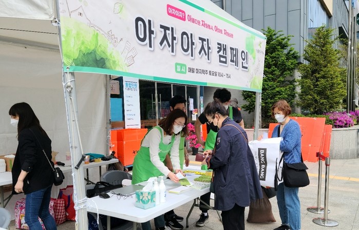 서울 서대문구가 지난 24일 주민들이 의류·도서 등을 기부하면 아름다운가게가 해당 물품을 판매하고 그 수익금을 공익활동에 사용하는 ‘아자아자 캠페인’을 진행했다. 사진은 이날 북가좌1동 주민센터 앞에서 열린 아자아자 캠페인 모습. (사진제공=서대문구청)