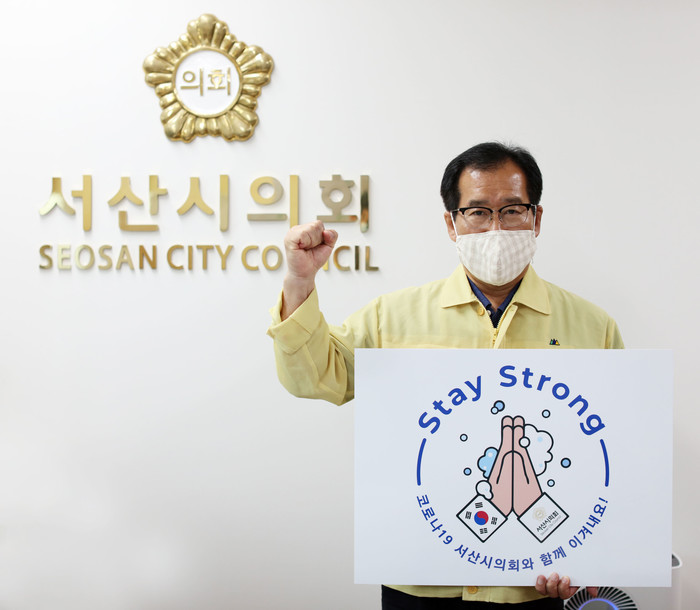 [서산=최진우 기자] 2일 충남 서산시의회 임재관 의장이 성숙한 시민의식으로 코로나19 위기를 극복하자는 메시지를 전하며 ‘스테이 스트롱’ 캠페인에 동참했다.