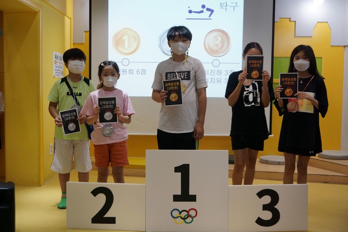서울 강동구 아동청소년 미래본부는 최근 지역내 아동 134명이 참여한 가운데 ‘미본 mini 올림픽’을 개최했다. 구 아동청소년 미래본부는 종목별로 우수한 성적을 거둔 3팀을 뽑아 시상했다. 사진은 mini 올림픽 시상식에서 어린이들이 기념촬영을 하는 모습. (사진제공=강동구청)