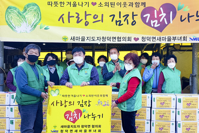 이날 행사에는 청덕면 새마을지도자 20여 명이 참여해 사랑과 정성으로 김장을 손수 담가 관내 도움의 손길이 필요한 독거노인 및 저소득 30가구에 전달했다.