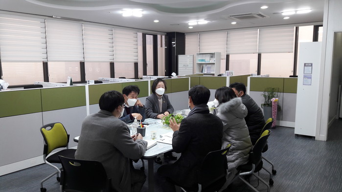 | ▲ 문경희 부의장과 김경근 의원이 구리남양주교육청 마을교육공동체 담당자들과 함께 교복은행 운영진의 애로사항을 청취하고 있다. (사진제공=경기도의회) |