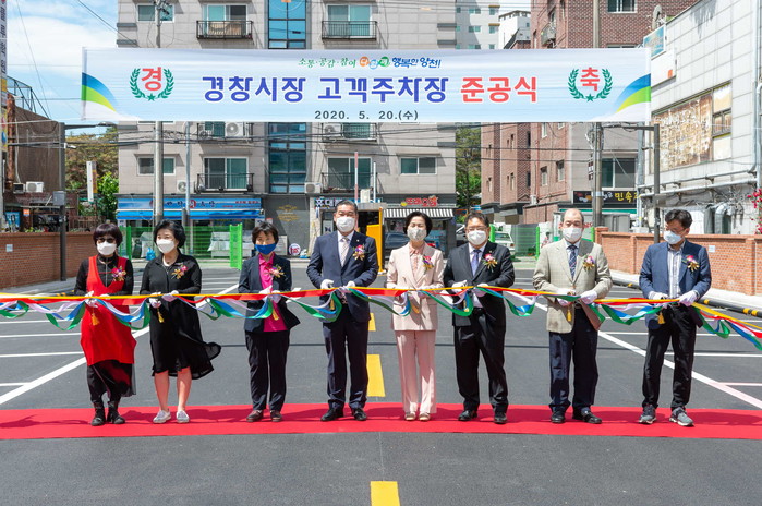 20일 김수영 서울 양천구청장(오른쪽 네번째)이 그간 시장 상인 및 이용객들의 숙원 사업이었던 경창시장 고객주차장 개소식에 참석했다. 사진은 김 구청장과 관계자들이 경창시장(오목로9길 31) 고객주차장에서 준공 기념 테이프 커팅식을 진행하고 있는 모습. (사진제공=양천구청)