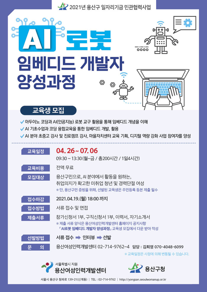 [시민일보 = 홍덕표 기자] 용산구(구청장 성장현)가 ‘일자리기금 민관협력사업’의 일환으로 용산여성인력개발센터와 함께 오는 4월26일~7월6일 '인공지능(AI) 로봇 임베디드(embedded) 개발자 양성과정'을 무료로 운영한다.