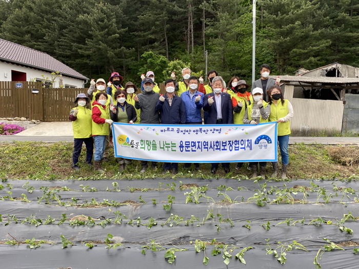 경기 양평군 용문면지역사회보장협의체는 지난 10일 용문면 덕촌리 인근의 무상으로 임대된 농경지에서 ‘사랑 나눔, 고구마 심기’를 진행했다. 이 고구마는 오는 10월 수확해 취약계층에 전달하고, 판매 수익금은 어려운 이웃을 위한 후원금으로 기탁할 예정이다. 사진은 이날 참여한 봉사자들이 기념촬영을 하는 모습. (사진제공=양평군청)