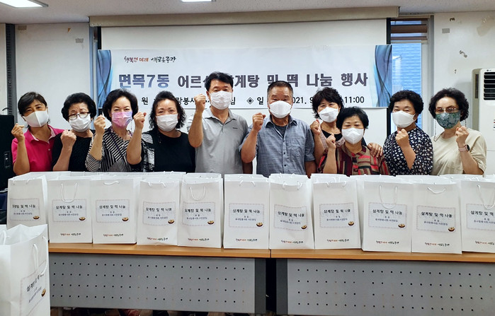 서울 중랑구 면목7동은 최근 저소득층 노인 100가구에 효사랑봉사회와 서진닭집에서 준비한 삼계탕과 떡을 전달했다. 사진은 전달식에서 관계자들이 기념촬영을 하는 모습. (사진제공=중랑구청)