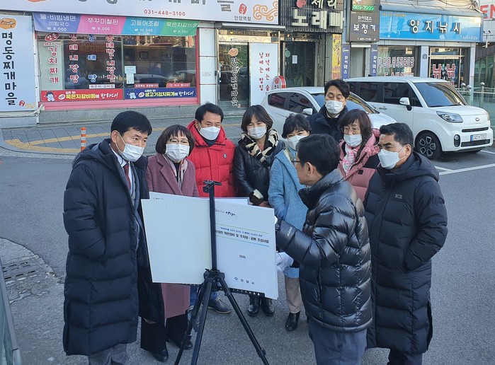 | ▲ 수암천 하천정비 및 주차장·공원 조성 사업 예정지를 방문한 안양시의원들이 관계자로부터 사업 설명을 듣고 있다. (사진제공=안양시의회) |