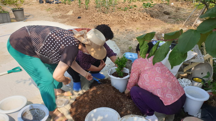 경기 포천시 가산면행정복지센터는 대한노인회 포천시지회 가산면분회와 ‘사랑의 꽃 기르기’ 프로그램을 오는 10월까지 운영한다. 사랑의 꽃 기르기는 경로당 이용 노인을 대상으로 6~10월 국화꽃을 가꾸고 전시회 등을 여는 여가 활동 프로그램이다. 사진은 최근 노인들이 국화를 화분에 심고 있는 모습. (사진제공=포천시청)