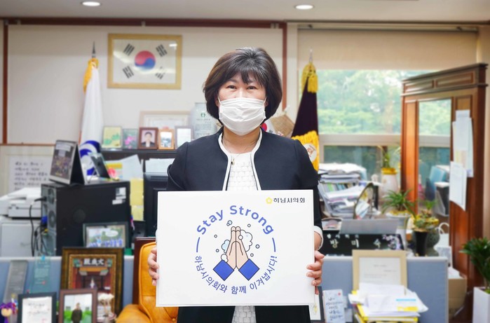 [하남=전용원 기자] 경기 하남시의회 방미숙 의장이 구리시의회 박석윤 의장의 지명을 받아 코로나19 위기를 건강하게 이겨내자는 ‘스테이 스트롱(Stay Strong)’ 캠페인에 동참했다.