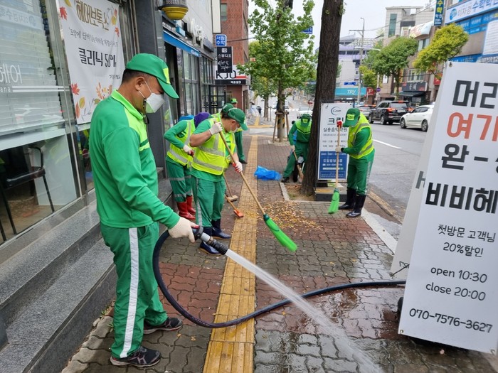 경기 수원시 권선구는 은행나무 낙과로 인한 보행자의 불편을 초래하는 상습악취 지역인 세류2·3동 및 권선1·2동 일대에서 최근 합동 물청소를 실시했다. 사진은 살수차량을 이용해 물청소를 하고 있는 모습. (사진제공=권선구청)