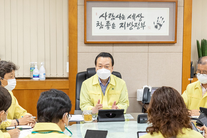 노현송 서울 강서구청장은 13일 ‘코로나19 긴급 대책회의’를 열고 사회적 거리두기 4단계 격상에 따른 구의 대응 태세 등을 집중 점검했다. 사진은 이날 노 구청장(가운데)가 회의를 주재하고 있는 모습. (사진제공=강서구청)