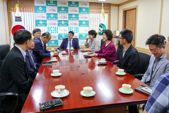 19일 서울 강남구의회 의상단이 2019년 하반기 인사 발령에 따른 의회사무국 전출직원들을 방문·격려했다. 사진은 구 보건소를 방문한 의상단이 전출 직원을 격려하고 있는 모습. (사진제공=강남구의회)