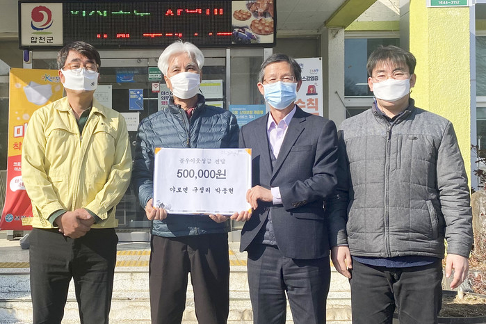 경남 합천군 야로면 나대리 출신으로 5년 전에 귀촌하여 구정리에 거주하고 있는 박종현(남, 67세)은 8일 야로면사무소(면장 권오송)를 방문해 어려운 이웃을 위해 써달라며 성금 50만원을 기탁했다.