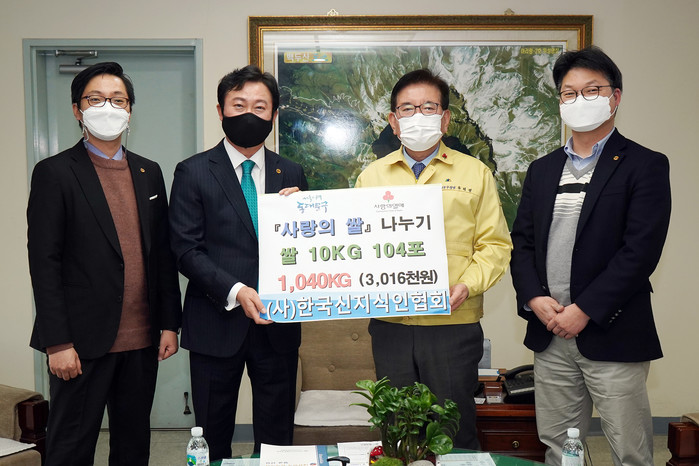 서울 동대문구는 6일 (사)한국신지식인협회 중앙회로부터 사랑의 쌀 1040kg(10kg 104포, 환가액 301만원)을 전달받았다. 기탁받은 쌀은 지역의 취약계층에 배부할 계획이다. 사진은 전달식에서 유덕열 구청장(오른쪽에서 두 번째)이 관계자들과 기념촬영을 하는 모습. (사진제공=동대문구청)