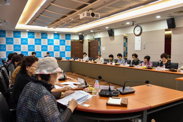 서울 강남구의회(의장 이관수)가 최근 구의회 6층 열린회의실에서 강남사랑환경지킴이 회원들과 간담회를 열고 소감과 애로사항을 청취한 후, 지역발전을 위해 힘써준 ▲박미자 부회장 ▲김미란 운영이사 ▲김선숙 운영이사 3명에게 감사장을 전달했다. 사진은 간담회 진행 모습. (사진제공=강남구의회)