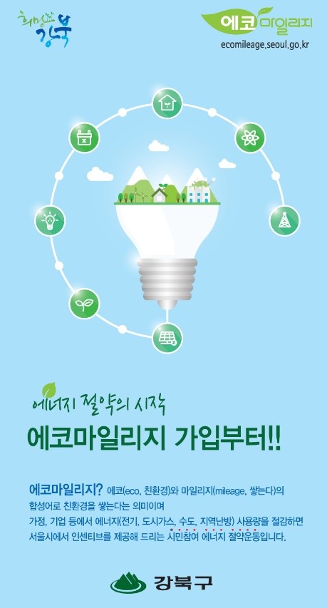 [시민일보 = 홍덕표 기자] 강북구(구청장 박겸수)는 에너지 절감률에 따라 마일리지로 돌려주는 '에코마일리지' 개인·단체 신규회원을 상시 모집하고 있다고 3일 밝혔다.