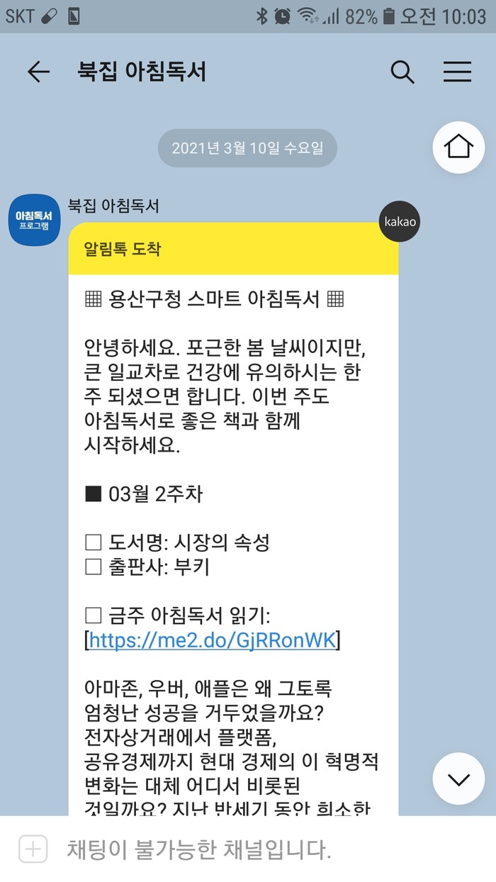 | ▲ 스마트 아침독서 프로그램 알림톡 화면. (사진제공=용산구청) |
