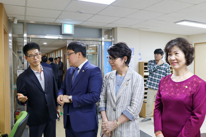 서울 강남구의회 의상단이 19일 강남구 보건소를 방문해 건강상담실, 금연클리닉, 방문건강 관리센터 등 시설을 둘러보고 직원들과 소통의 시간을 보냈다. 사진은 보건소 직원들의 안내를 받으며 시설을 둘러보고 있는 의상단의 모습. (사진제공=강남구의회)