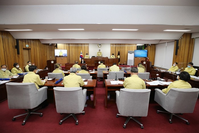 | ▲ 해남군의회는 5일 전군민에게 지급하는 재난기본소득 지원금 지급 내용이 담긴 ‘2021년 제1회 추가경정예산안’을 원안 가결 시켰다. 사진은 제309회 임시회 진행 모습. (사진제공=해남군의회) |