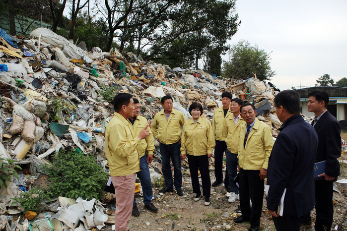 전남 영암군의회는 최근 열린 제269회 임시회 제1차 본회의에서 주요사업장 현장방문 특별위원회를 구성해 주요 민원발생 현장에 방문했다. 사진은 신북면 이천리 쓰레기 불법투기 현장에 방문한 의원들이 문제점 및 개선방안에 대해 논의하는 모습. (사진제공=영암군의회)