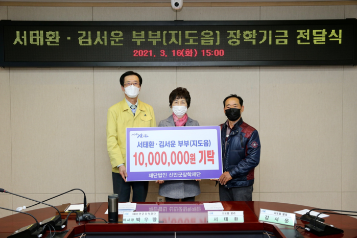| ▲ 지도읍 서태환 ‧ 김서운 부부, 신안군장학재단에 장학기금 1천만원 기탁 |