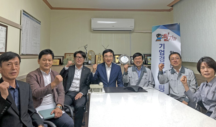| ▲ 찾아가는 원스톱 기업경영 컨설팅에서 이동진 구청장(가운데)이 기업 관계자들과 파이팅을 외치며 기념촬영을 하고 있다. (사진제공=도봉구청) |