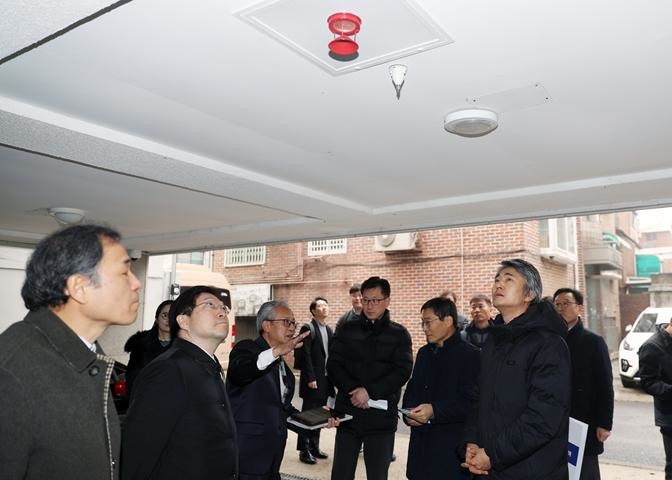서울시의회 도시계획관리위원회 김인제 위원장(오른쪽)은 10일 본격적인 동절기를 맞아 강북구 수유동에 위치한 '서울시 매입임대주택 현장'을 방문해 임대주택내 화재예방시설에 대한 실태 점검을 실시했다. 사진은 서울주택도시공사(SH) 관계자들과 시설을 살피고 있는 모습. (사진제공=서울시의회)