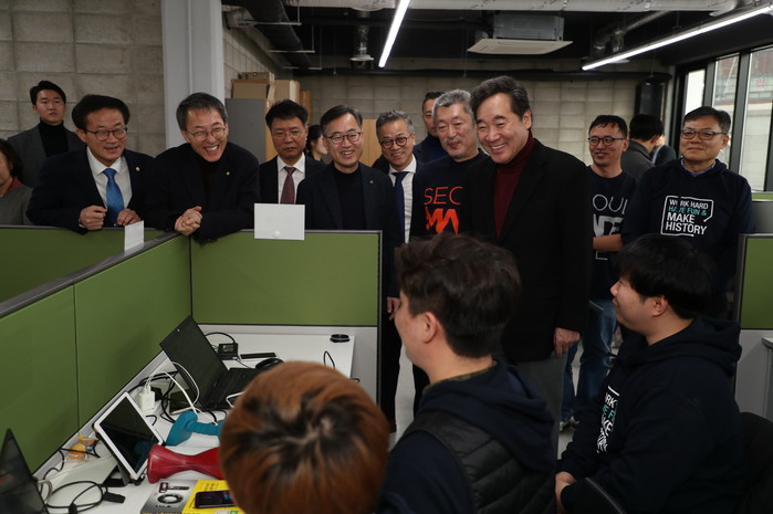 유성훈 서울 금천구청장이 지난 4일 이낙연 국무총리와 함께 금천구 가산동에 위치한 메이커스페이스 G-CAMP를 방문, ‘저전력 장거리 무선통신기술’ 서울하드웨어 헤커톤 행사를 참관하고 참가자들을 격려했다. 사진은 유 구청장과 이 총리가 하드웨어 해커톤 행사를 참관하고 있는 모습. (사진제공=금천구청)