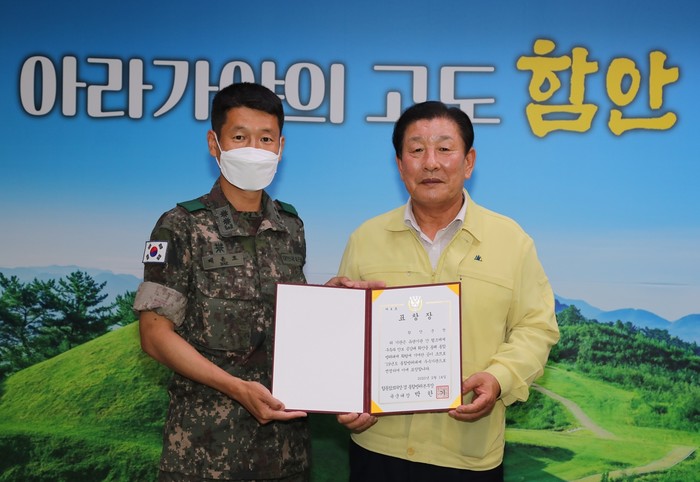 군수실에서 진행된 이날 표창 수여식에서는 배윤호 제5870부대 5대대장이 참석해 조근제 함안군수에게 표창을 수여했다.