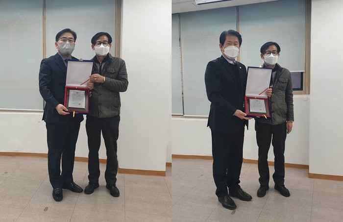 | ▲ 제갑섭 부의장(왼쪽)과 양평호 건설재정위원장(오른쪽)이 감사패를 받고 기념촬영을 하고 있다. (사진제공=강동구의회) |