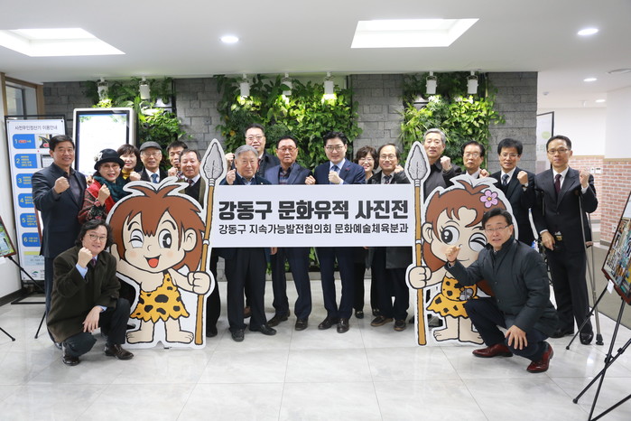 이정훈 서울 강동구청장이 지난 3일 구청 제2청사 1층 로비에서 열린 ‘강동구 문화유산 사진전’ 개막식에 참석했다. 이번 사진전에는 문화유적 답사를 통해 발굴한 사진 16점이 전시된다. 사진은 기념촬영을 하고 있는 이 구청장과 관계자들의 모습. (사진제공=강동구청)