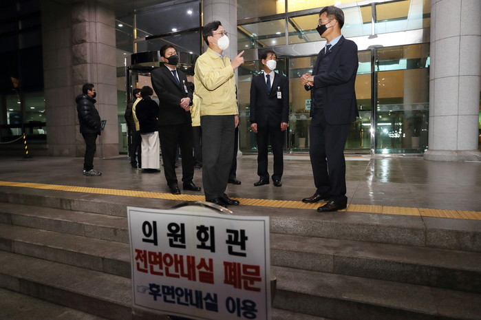 서울 영등포구는 최근 국회에서 열린 토론회 참석자 중 한 명이 코로나19(우한폐렴) 확진 판정을 받음에 따라 지난 24일 국회 본관, 의원회관 등을 폐쇄하도록 하고 방역작업을 했다. 사진은 채현일 구청장이 국회 관계자들과 대책을 논의하고 있는 모습. (사진제공=영등포구청)