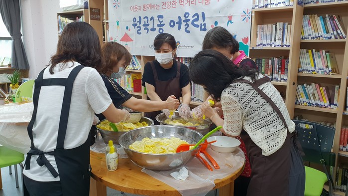 서울 성북구 월곡1동 주민 모임 어울림이 최근 친환경 식생활에 대한 정보를 나누고, 친환경 레몬 청 등 각종 과일 청을 만들어 지역 노인들에게 전달하는 '이웃과 함께하는 건강 먹거리 나눔 행사'를 개최했다. 사진은 회원들이 레몬청을 만들고 있는 모습. (사진제공=성북구청)
