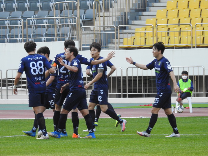 진주시민축구단이 지난 17일 진주종합경기장에서 펼쳐진 2020 K4리그 21라운드 경기에서 라이 벌인 인천 남동 구민 축구단을 4 대 1로 꺾고 승리하며 무서운 기세로 승격을 향해 달려가고 있다.