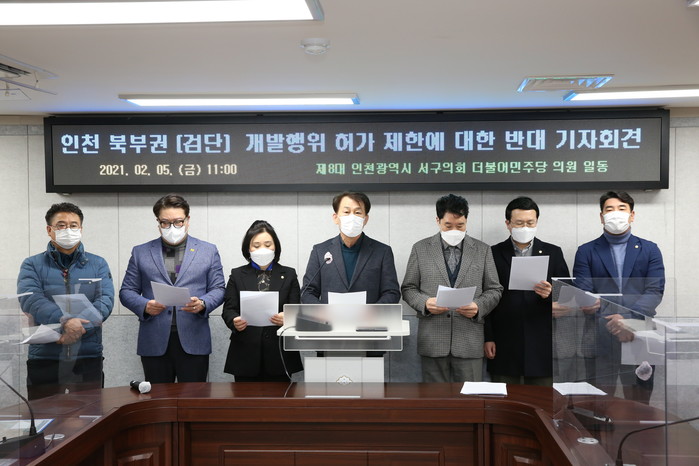 [인천=문찬식 기자] 인천 서구의회 더불어민주당 소속 의원들이 최근 서구의회 의원간담회장에서 인천시가 환경과 경관 손상 및 난개발이 우려된다는 이유로 계획하고 있는 서구 북부권 검단지역 일원의 개발행위허가제한에 대해 반대 성명을 발표했다.