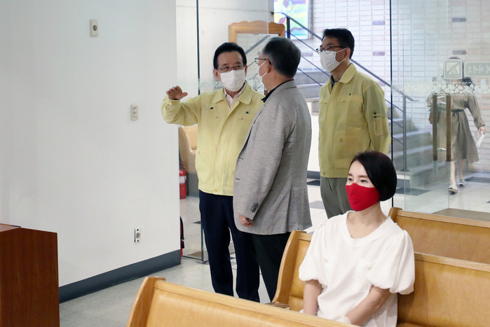 7일 정순균 서울 강남구청장(왼쪽)이 최근 소규모 종교시설 및 소모임에서 코로나19 확진자가 증가함에 따라 주말 예배를 진행하는 지역내 소규모 교회를 방문해 소모임 현황과 소모임 방역관리자 지정 여부, 방역현황, 감염병 예방지침 준수 여부 등을 점검했다. (사진제공=강남구청)
