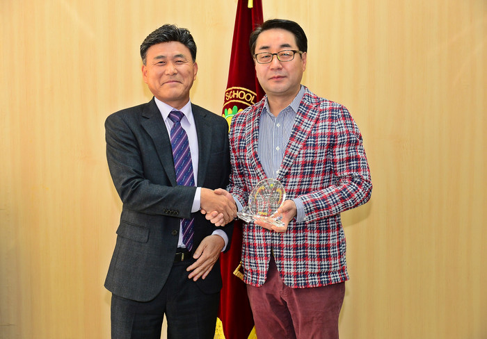 ▲ 최민규 의원(오른쪽)이 대방중학교 교장과 기념촬영을 하고 있다. (사진제공=동작구의회) |