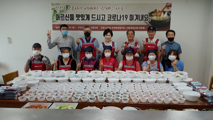 이 의원은 최근 삼전동주민센터에서 삼전동통장협의회의 주관으로 열린 ‘코로나19 이겨내는 삼계탕 나눔행사’에 참석, 취약계층 노인 50명에게 전달될 삼계탕과 밑반찬 등의 조리·포장에 참여했다.
