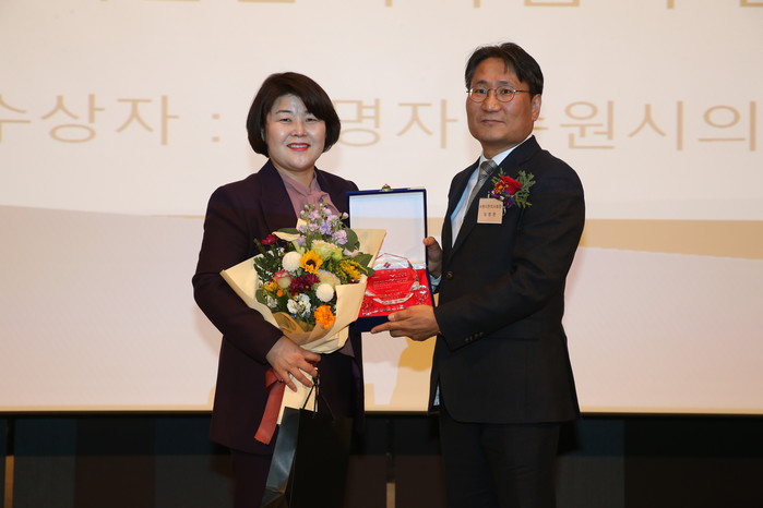 | ▲ 조명자 의장(왼쪽)이 감사패를 받은 후 기념촬영을 하고 있다. (사진제공=수원시의회) |