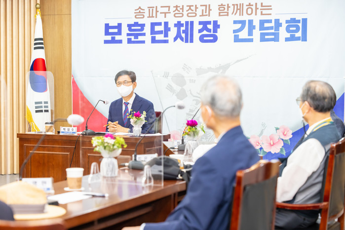 서울 송파구는 최근 ‘2021년 구청장과 보훈단체장과의 간담회’를 개최했다. 사진은 이날 간담회에 참석한 박성수 구청장(왼쪽)이 국가유공자들과 대화를 하고 있는 모습. (사진제공=송파구청)