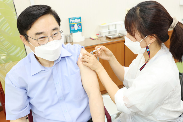 이동진 서울 도봉구청장이 지난 4일 도봉구보건소를 찾아 아스트라제네카(AZ) 2차 예방접종을 받았다. 사진은 이 구청장(왼쪽)이 AZ 2차 접종을 받고 있는 모습. (사진제공=도봉구청)