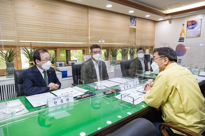 광진구는 최근 KB국민은행·신한은행·하나은행 및 서울신용보증재단과 ‘광진구 소상공인 특별보증 및 이자지원 업무협약’을 체결했다. 협약을 통해 지역 소상공인 대상 최대 2000만원까지 1년간 무이자 대출이 지원된다. 사진은 협약식에서 김선갑 구청장(오른쪽)이 관계자들과 이야기를 나누고 있는 모습. (사진제공=광진구청)