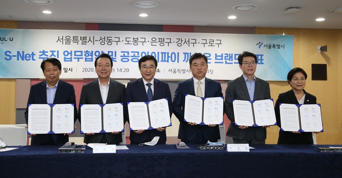 서울 강서구는 9일 서울시와 ‘스마트서울 네트워크(S-net) 구축을 위한 업무협약’을 체결했다. 이날 협약에 따라 구와 시는 시민의 통신기본권을 보장하고 미래 스마트도시 서비스기반 마련을 위한 유무선 통신망을 구축하는 데 협력키로 했다. 사진은 노현송 구청장(왼쪽에서 두 번째)이 참석자들과 기념촬영을 하고 있는 모습. (사진제공=강서구청)