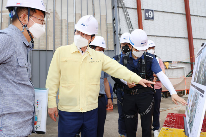 이동진 서울 도봉구청장이 최근 도봉구 창동 일대 신경제중심지 조성사업의 일환인 창업및문화산업단지, 로봇박물관, 사진미술관 건축 현장을 찾아 점검했다. 사진은 이날 이 구청장(가운데)이 씨드큐브 창동 건축현장을 찾아 관계자들과 진행사항 등을 검토하는 모습. (사진제공=도봉구청)